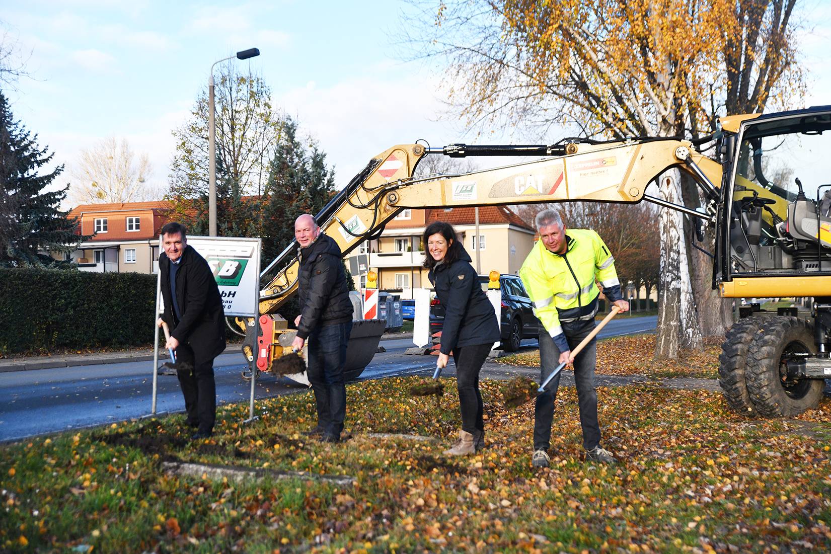 Nahmen den Spatenstich vor: Landrat Thomas Balcerowski, der stellv. Oberbürgermeister der Stadt Halberstadt, Thomas Rimpler, die Geschäftsführerin der Halberstädter Verkehrs-GmbH, Claudia Stein und der Geschäftsführer der Baufirma TSB Harz GmbH, Detlef Rosenbusch.
