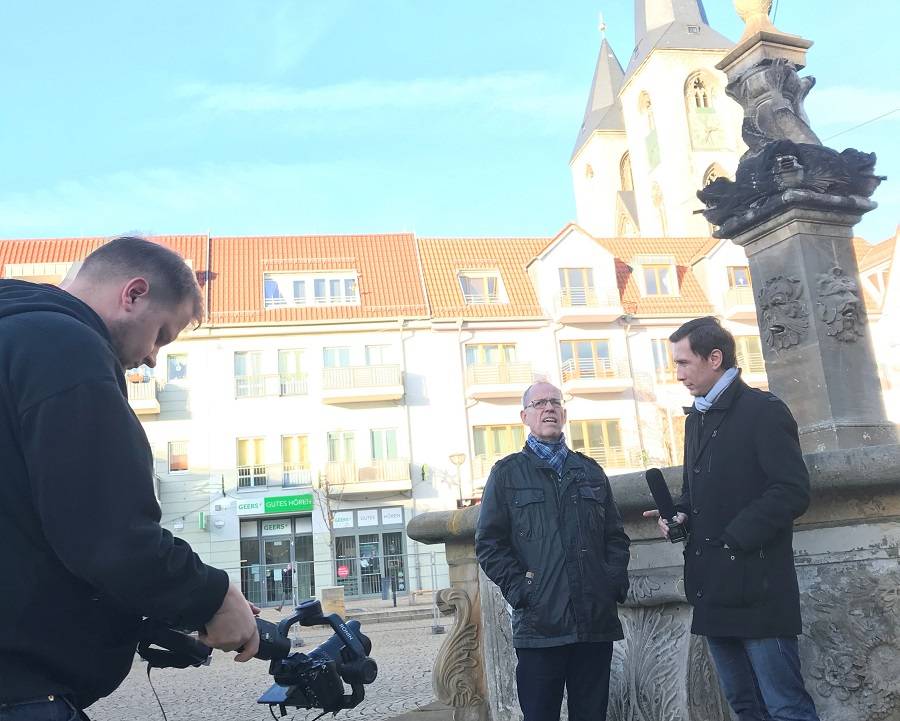 HomeAn einem sonnigen Novembertag stehen Dr. Volker Bürger, Stadtratspräsident und Vorsitzender des Geschichtsvereins, und Daniel Szarata, Landtagsabgeordneter und Stadtrat, auf dem Halberstädter Holzmarkt vor der Kamera – im Hintergrund der Holzmarktbrunnen und die Martinikirche.