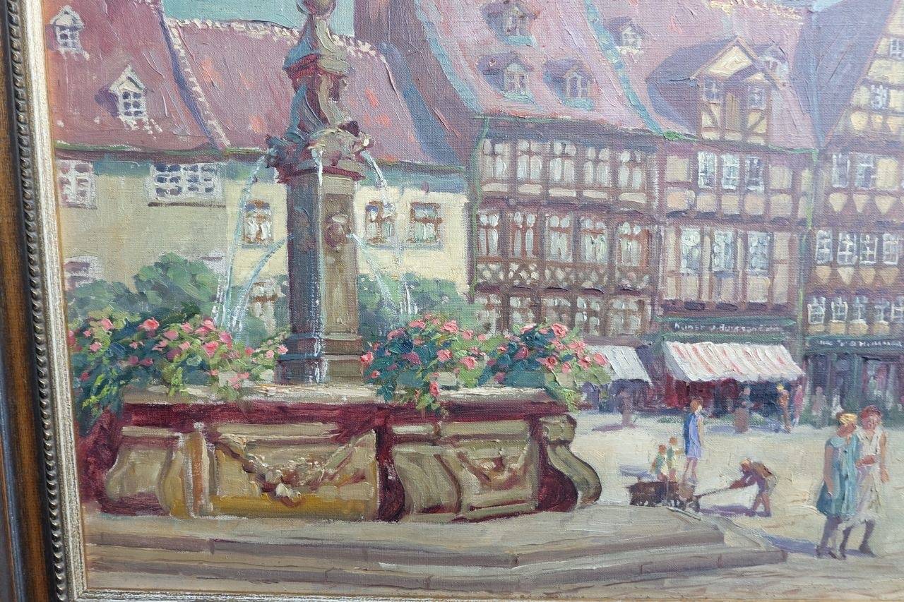 „Das wertvolle, großformatige Gemm-Gemälde wurde von unzähligen Halberstädtern am 22. September in der ZDF Sendung „Bares für Rares“ (ab Minute 34:38) entdeckt. Das aus dem Jahr 1930 stammende Bild zeigt den Holzmarkt mit Blick zur Martini Kirche. Obwohl Walter Gemm dieses beliebte Motiv im Laufe seines Lebens mehrmals gezeichnet hat, hebt sich dieses Bild durch seine Größe und vor allem durch sein Erscheinungsjahr (1930) ab. Denn im Gegensatz zu vielen seiner späteren Werke, die nach der Zerstörung unserer Heimatstadt entstanden sind, konnte sich der Maler hier noch an der originalen Bausubstanz orientieren.