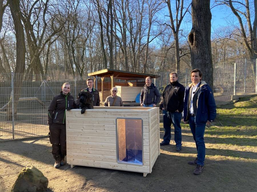 Frau Christin Böer, Tierpflegerin Fundtierunterkunft, erklärt begeistert die Funktionsweise. Allerdings sind noch einige Wünsche offen. Frau Böer erläutert, dass die Hütten noch einen festen Untergrund benötigen, Gehwegplatten könnten dies ermöglichen.
