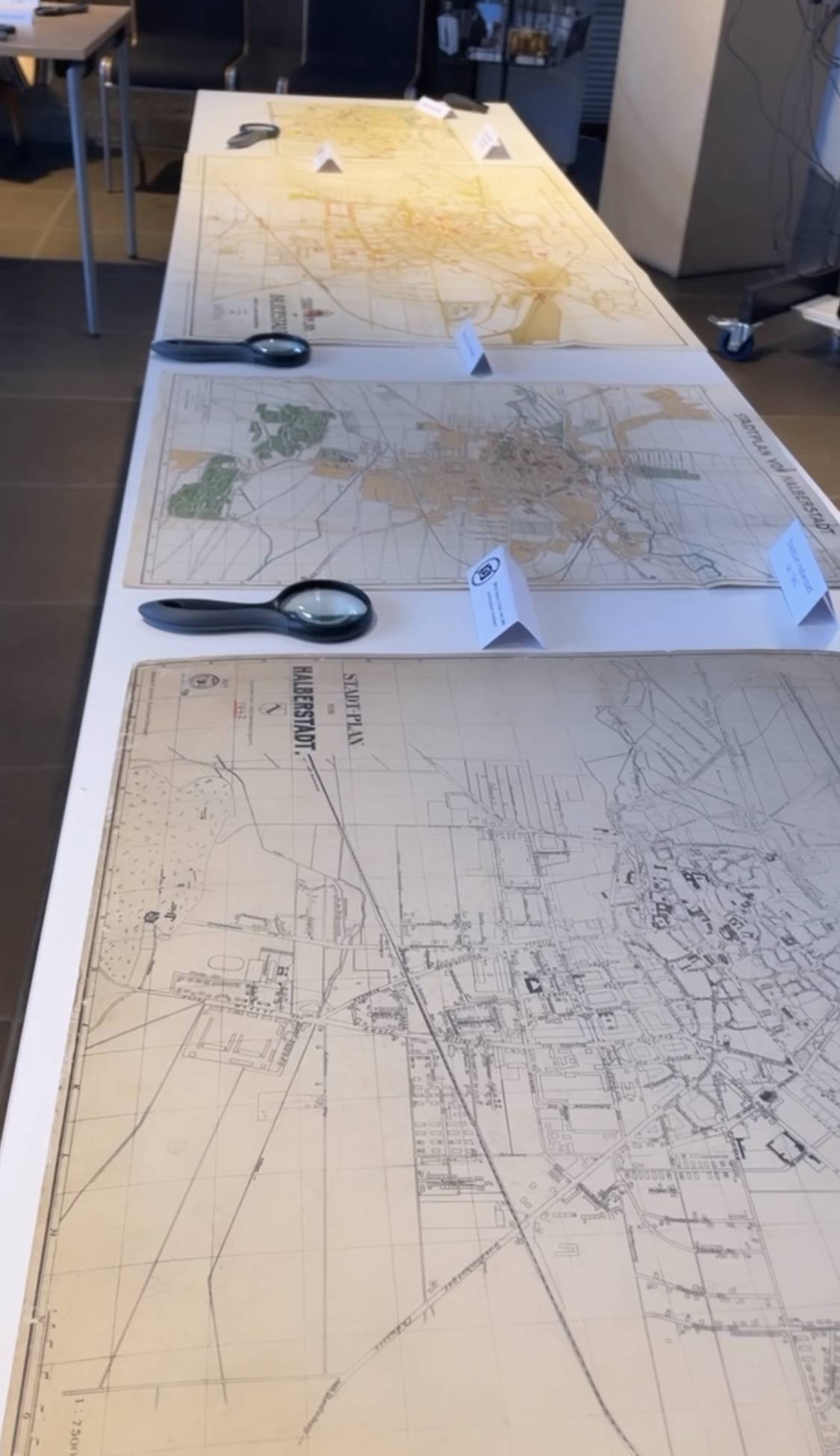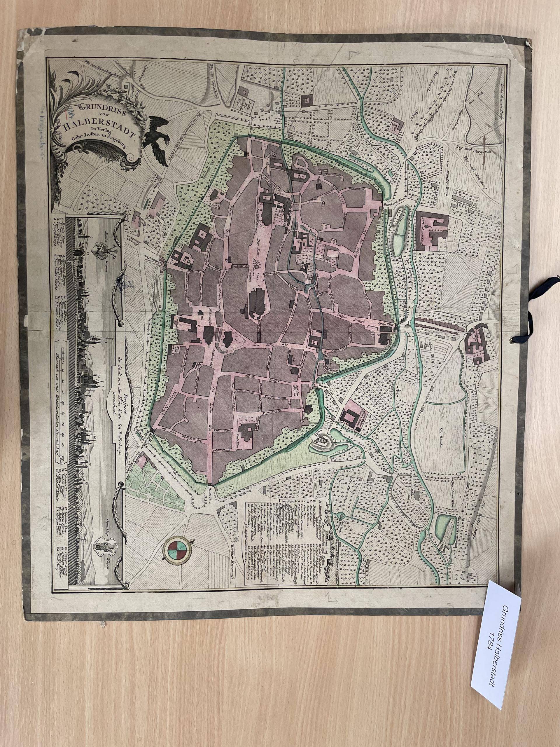 Dieses Mal wurde die Kartensammlung in den Fokus gerückt und Stadtpläne Halberstadts für die Besucher und Besucherinnen vorbereitet. Der älteste ausgelegte Stadtplan ist ein Grundriss Halberstadts aus dem Jahr 1784. Er wurde vermutlich mit Aquarell koloriert und zeigt sehr schön, dass Halberstadt sich im ausgehenden 18. Jahrhundert noch auf den Bereich innerhalb der Stadtmauern begrenzte. Auch der heutige grüne Ring ist bereits ersichtlich – anhand der Karte kann man gut nachvollziehen, wie diese Parks damals entstanden sind – als Umgrenzung der Stadtmauer.