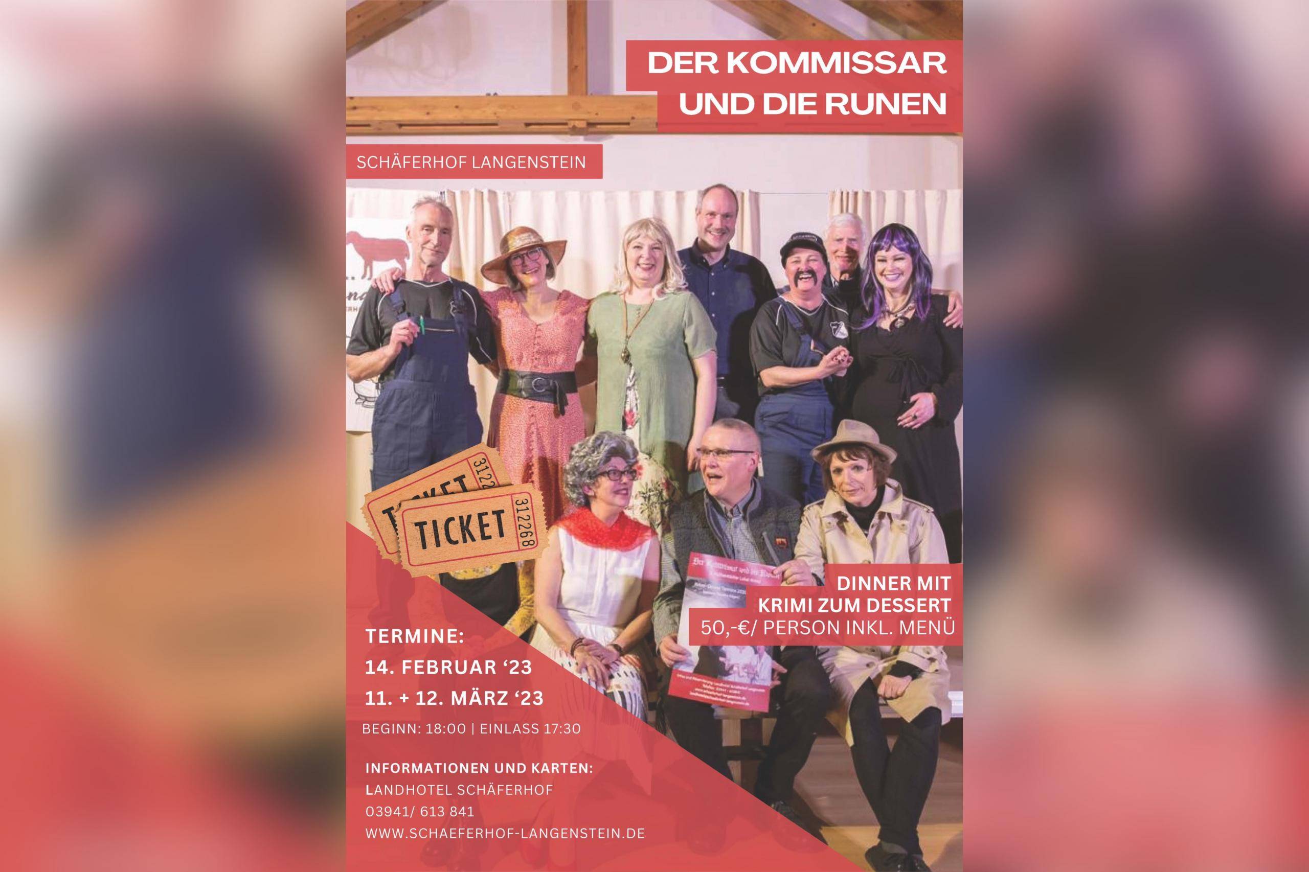 HomeNach langer Corona-Pause kann das Ensemble der Halberstädter Spielgemeinschaft endlich wieder zu Vorstellungen in das Landhotel Schäferhof in Langenstein einladen. Nach einem Dreigänge-Menü, gleichsam als Dessert, erleben die Besucher den Lokal-Krimi „Der Kommissar und die Runen“.