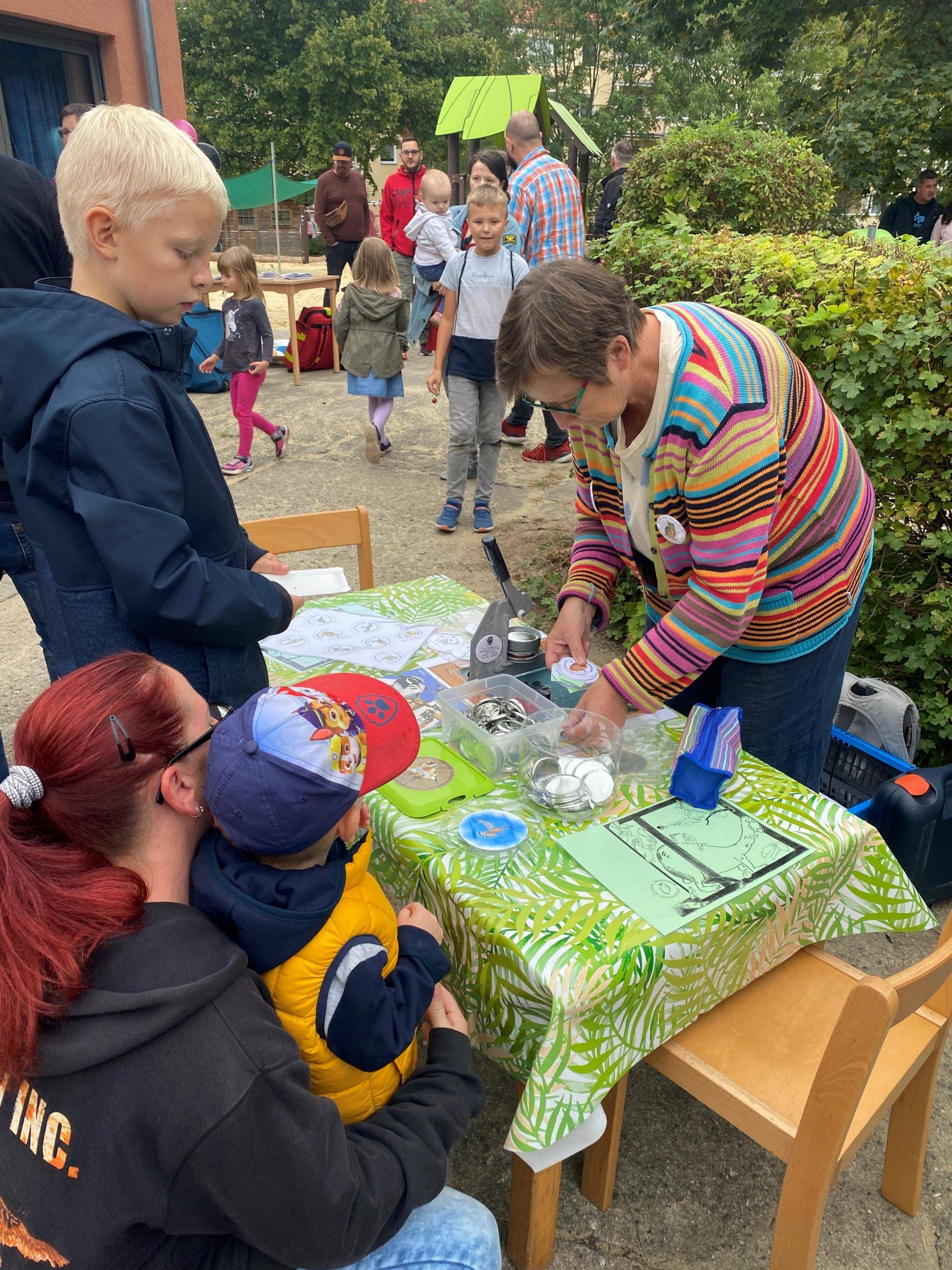 Bildunterschrift : Zahlreiche Angebote für Kinder gab es auf dem Fest der Kita Waldblick I und II. Hier zeigt Evelyn Winkelmann vom Naturkundemuseum Heineanum, wie man einen Button selbst herstellt.