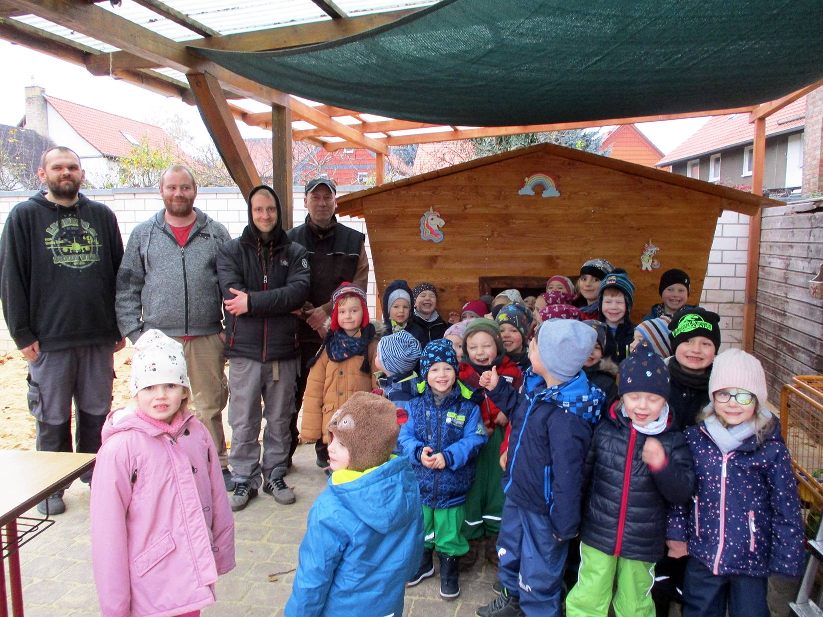 Kurz vor der offiziellen Weihnachtszeit überreichten sie der Kindertagesstätte „Sonnenschein“ im Schachdorf Ströbeck ein großes Geschenk. Begleitet von vielen freudigen Kinderaugen, wurde ein Holzspielhaus aufgebaut. Nachdem das Haus fertiggestellt war, wurde es sofort von allen Kindern bespielt.