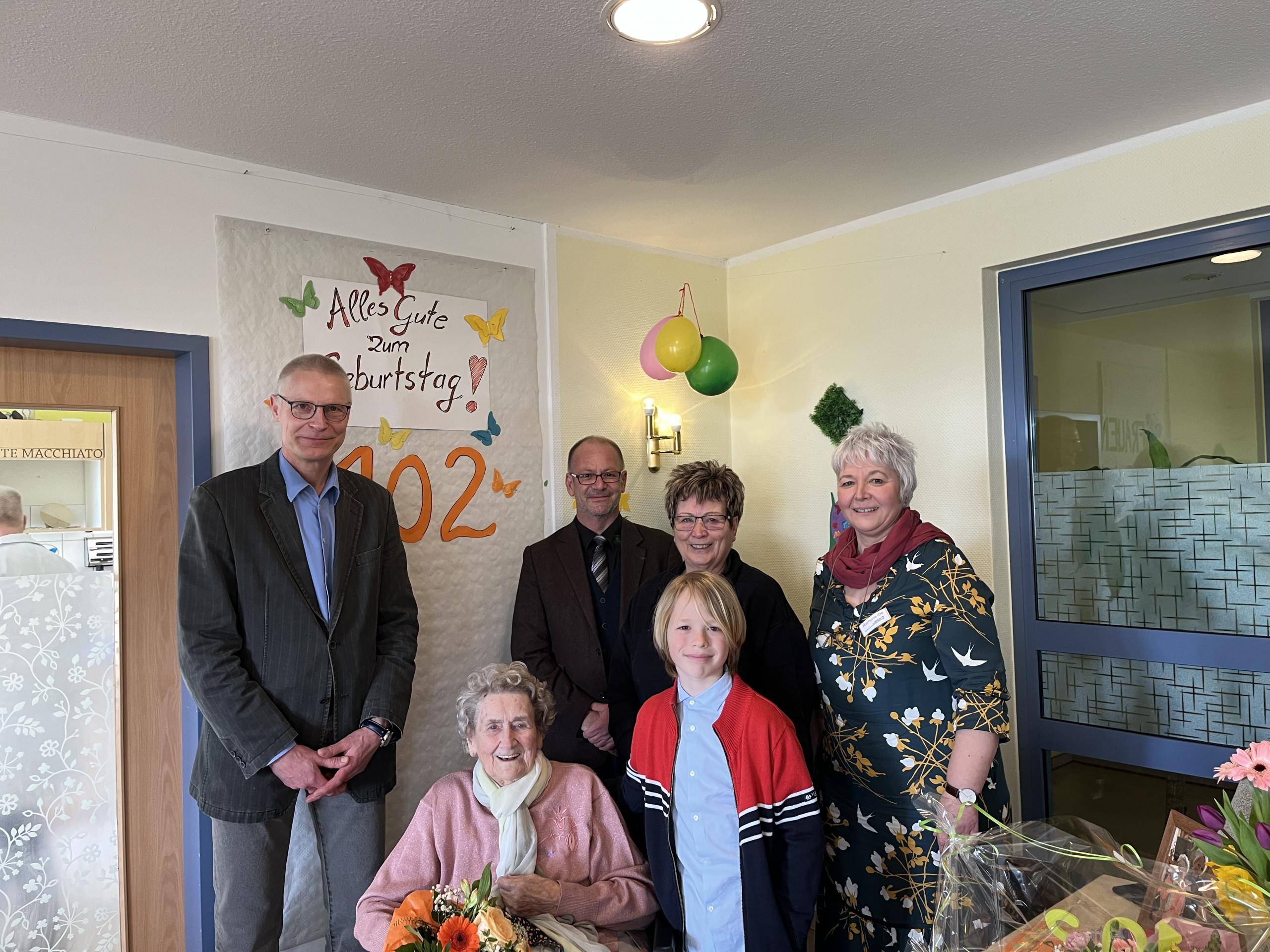 Ursula Kraul freute sich gemeinsam mit ihrer Familie und dem Verwaltungsdirektor Holger Thiele, Vorstand des Diakonissen-Mutterhauses Cecilienstift Halberstadt, sowie der Leiterin des Seniorenparks, Ramona Ibe, über die erhaltenen Grüße.