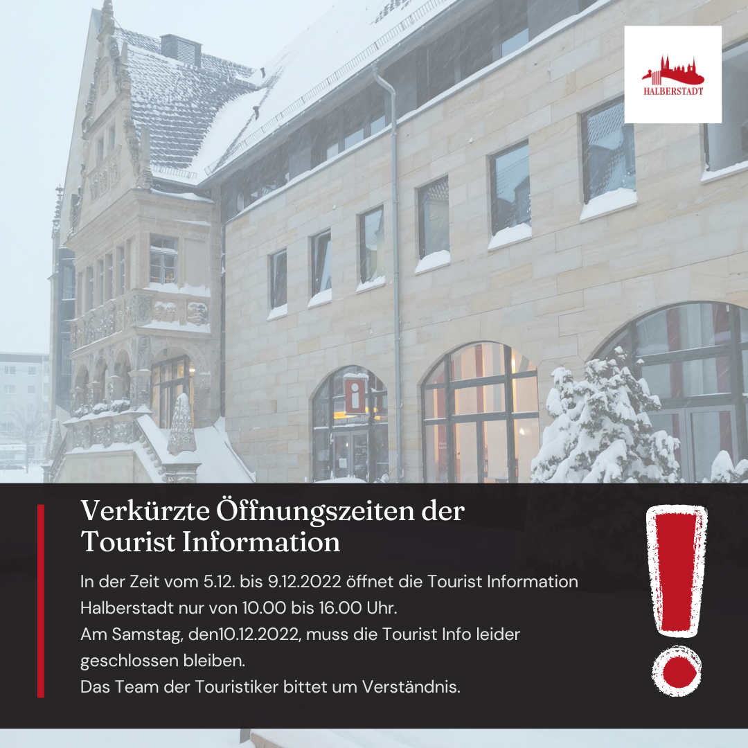 HomeIn der Zeit vom 5.12. bis 9.12.2022 öffnet die Tourist Information Halberstadt aus innerbetrieblichen Gründen nur von 10.00 bis 16.00 Uhr.