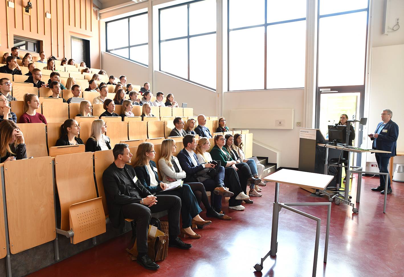 Verschiedene Institutionen stellten sich dabei mit Kurzvorträgen vor. Der vollbesetzte Hörsaal zeugte vom großen Interesse der Studierenden. An den Messeständen im Festsaal konnten sich diese gezielt über Praktika, Stellenangebote oder praxisorientierte Bachelor- und Masterarbeiten informieren.