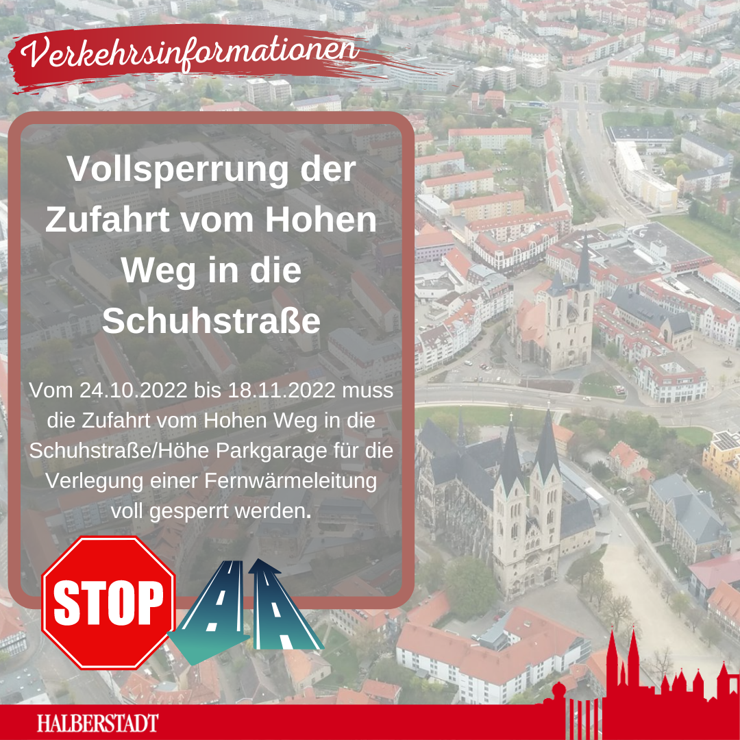 HomeVom 24.10.2022 bis 18.11.2022 muss die Zufahrt vom Hohen Weg in die Schuhstraße/Höhe Parkgarage für die Verlegung einer Fernwärmeleitung voll gesperrt werden.