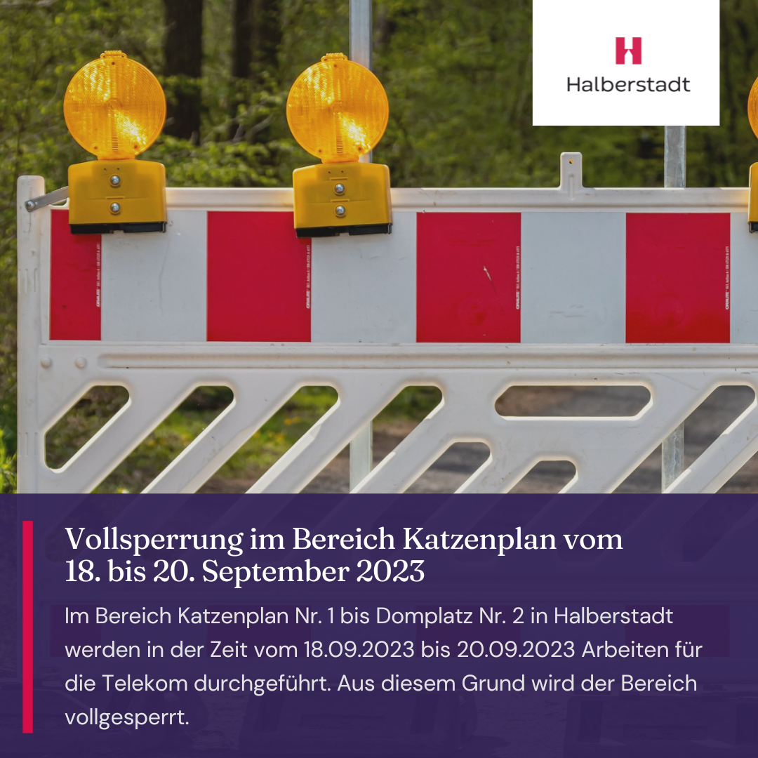 HomeIm Bereich Katzenplan Nr. 1 bis Domplatz Nr. 2 in Halberstadt werden in der Zeit vom 18.09.2023 bis 20.09.2023 Arbeiten für die Telekom durchgeführt. Aus diesem Grund wird der Bereich vollgesperrt.