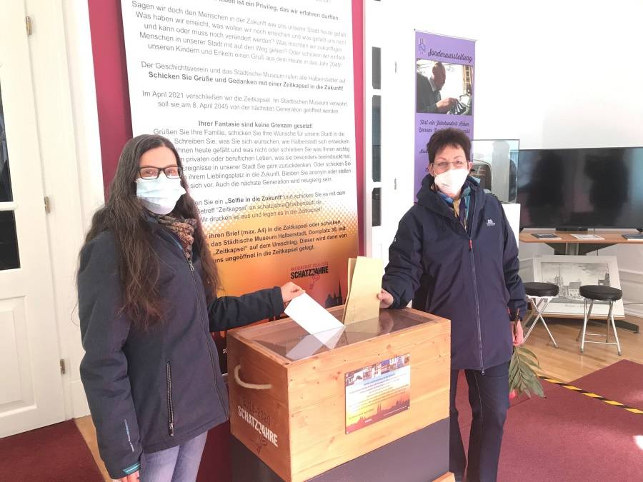 Nachdem schon Politiker und Stadträte dem Aufruf, die Zeitkapsel zu füllen, zahlreich folgten, haben nun auch die ehemalige Leiterin des Kulturbüros, Sabine Moczko, und die aktuelle neue Amtsinhaberin, Dr. Sandra Salomo, kürzlich im Museum ihre Botschaft für die Zeitkapsel übergeben. So hofft Sabine Moczko, „dass die Menschen auch 2045 noch gern in die Halberstädter Museen und ins Theater gehen werden, dass sie auch weiterhin stolz auf ihre Kultur und ihre Stadt sind.“ Sie ist sicher, „dass es auch in 24 Jahren noch eine bedeutungsvolle Kultur in Halberstadt geben wird“.