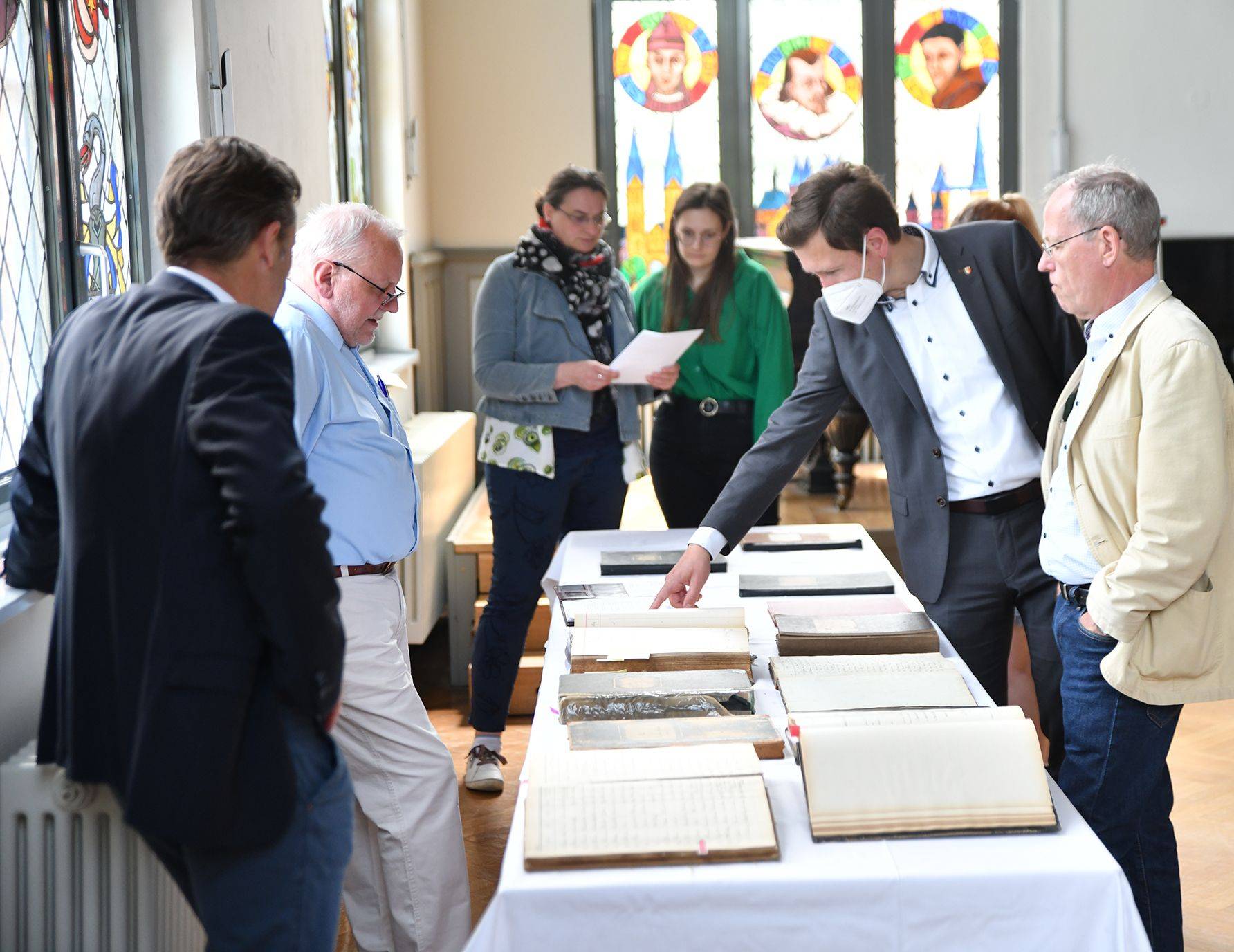 Vor wenigen Tagen wurde der Aktenschatz in der Aula des Martineums präsentiert. Neben Dr. Volker Bürger, Vorsitzender des Geschichtsvereins, Oberbürgermeister Daniel Szarata als ehemaliger Martineer, Museumsdirektorin Dr. Antje Gornig und Sophia Steinmetz vom Stadtarchiv, nahmen auch einige Schüler der 11. Klasse mit ihrem Geschichtslehrer die 13 Bücher in Augenschein, die anschließend dem Stadtarchiv übergeben wurden.