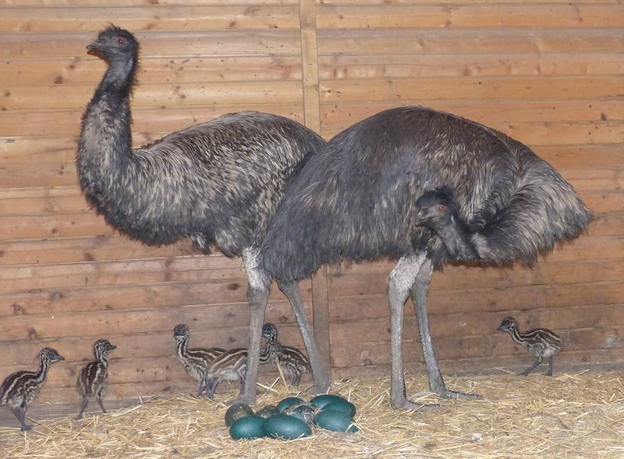 HomeSieben junge Emuküken sind kürzlich im Tiergarten Halberstadt geschlüpft. Zehn türkisblaue Eier liegen noch im Nest. Und Zooinspektor Michael Bussenius ist gespannt, wieviel Küken daraus noch gesund und munter schlüpfen werden. 54 Tage dauert das Brüten bei diesen in Australien heimischen Tieren, die ausgewachsen 45 Kilogramm auf die Waage bringen und bis zu 50 km/h laufen können. Bis die Kleinen soweit sind, wird es noch eine Weile dauern. „Die Emuküken sind immer eine Attraktion in unserem Tiergarten“, berichtet Michael Bussenius und erzählt, dass dieses Pärchen namens Melbourne und Sydney bereits seit zehn Jahren hier leben und bereits zum dritten Mal in Halberstadt Küken auf die Welt gebracht haben. Der Tiergarten wird die jungen Emus nicht behalten können, sondern an andere Zoos und Tierparks weitergeben.