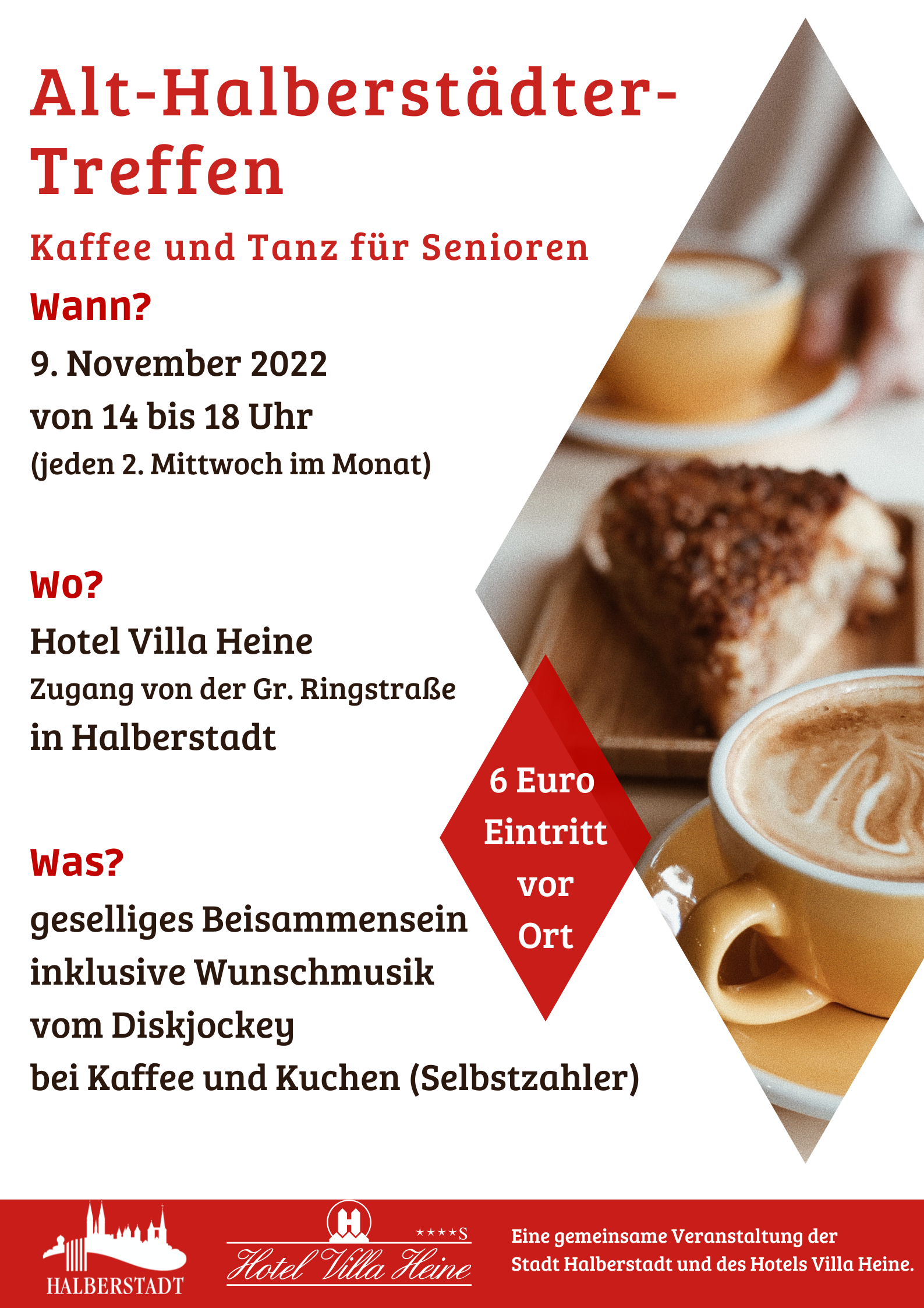 Bitte vormerken: Nach dem 9. November findet das Alt-Halberstädter-Treffen wieder am 14. Dezember 2022 statt (jeden zweiten Mittwoch im Monat). Abhängig von der Resonanz wird das Treffen im nächsten Jahr fortgesetzt. Beginn ist immer 14 Uhr, das Ende ist um 18 Uhr. Der Eintritt beträgt 6 €. Kaffee und Kuchen sowie andere Getränke können vor Ort erworben werden.
